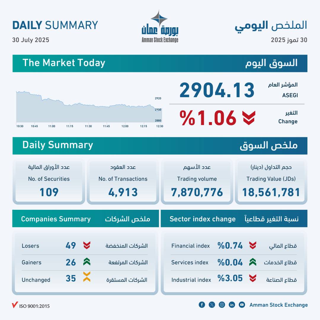 18.6 مليون دينار حجم التداول في بورصة عمان اليوم