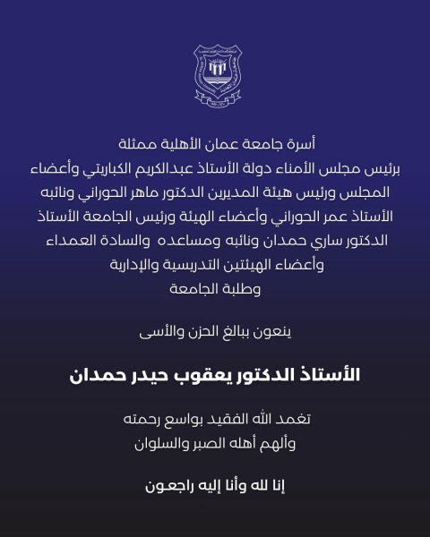 أسرة جامعة عمان الأهلية تنعي المرحوم أ.د. يعقوب حيدر حمدان